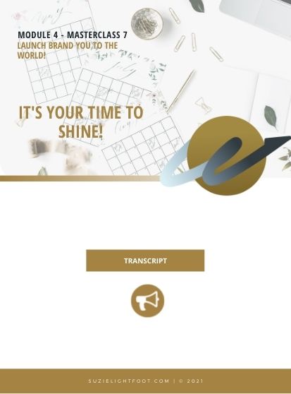 If you need any further guidance and support during your Brand Success Formula Journey, I am here for you every step of the way! Feel free to email me at suzie@suzielightfoot.com for assistance. If you are having technical issues, please contact my team at admin@suzielightfoot.com. You may also reach us in our FB community Click here>>